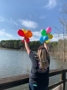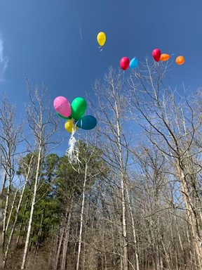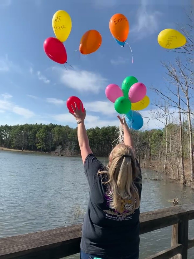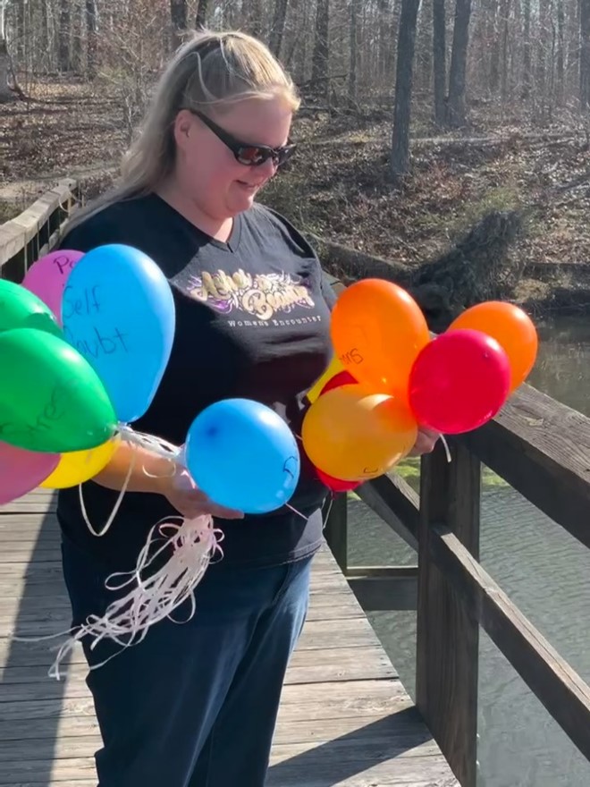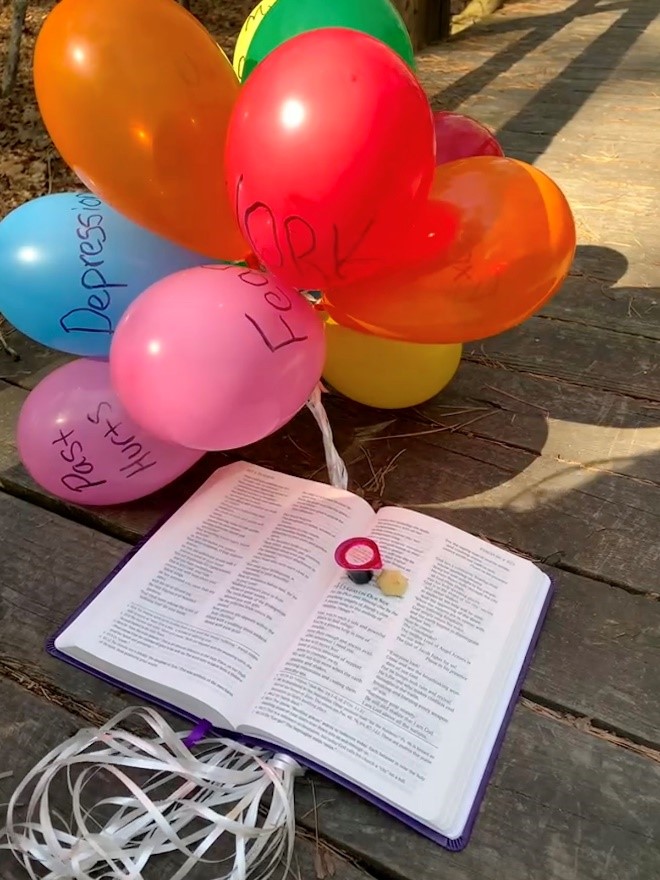 After feeling this deliverance, I wanted to complete a visual part of my healing. I took helium filled balloons and wrote words that represented my problems on them so I could release them to God. I went with my mother to Shawnee Mack Lake, where we have been walking and talking over the last several weeks during my healing process. The wind was strong that day, so we took the balloons along a path to a bridge where it was calmer. When we arrived, we realized the wind had tangled all the balloon strings. We broke some free but six of them were left tied in a bundle. I said a prayer telling God I was releasing all my pain and problems to Him, because I could not hang on to them anymore. Then I raised the balloons into the air and let them fly!